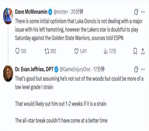 在McMenamin的最新報道出來后,Jeffries跟進表示,這樣的結(jié)果算是不錯了,但他的情況還不能完全掉以輕心,大概率只是一級輕度拉傷。如果確診是拉傷的話,他很可能會缺陣1-2周。全明星周末來得真是太是時候了。顯然,Jeffries認(rèn)為全明星周末會是很好的養(yǎng)傷時間。 當(dāng)然,這也意味著東契奇可能缺席全明星,世界隊將又損一員大將。此前,字母哥、亞歷山大都已經(jīng)因傷無緣參加全明星。 |