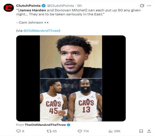掘金球員卡梅倫-約翰斯在直播時談到哈登+米切爾的組合,他表示:騎士隊會變得非常強大,因為哈登、米切爾兩人都是可以一場50+的球員,米登組合會非常之恐怖。