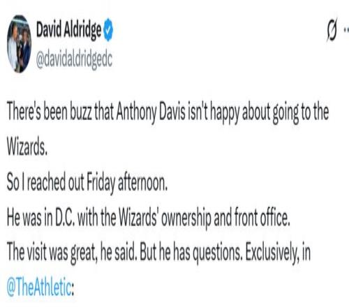 戴維斯將穿23號(hào)奇才球衣,上一位是穿奇才23號(hào)的是23年前的喬丹。 這位10屆全明星球員、5次入選最佳陣容一陣、5次入選最佳防守陣容,同時(shí)也是NBA75大巨星之一的球星坦言,奇才隊(duì)率先出手交易得到自己,確實(shí)出乎他的意料。對(duì)于溫格和道金斯推動(dòng)的球隊(duì)重建計(jì)劃,他持開(kāi)放態(tài)度——目前球隊(duì)已吸納亞歷克斯-薩爾、基肖恩-喬治、特雷-約翰遜和比拉爾-庫(kù)利巴利等一眾潛力新星。 盡管如此,戴維斯仍希望與球隊(duì)決策層展開(kāi)更深入的探討,明確球隊(duì)的規(guī)劃藍(lán)圖——不僅要重返季后賽,更要成為總冠軍的有力爭(zhēng)奪者。 戴維斯與球隊(duì)的合同將在2026-27賽季結(jié)束后到期,2027-28賽季他擁有價(jià)值6270萬(wàn)美元的球員選項(xiàng),下賽季的薪資則為5840萬(wàn)美元。(今年1月中旬,戴維斯接受了手部手術(shù),預(yù)計(jì)缺陣至少六周,最早將于3月初重返賽場(chǎng)。) “我需要和威爾、泰德、扎克好好聊聊,弄清楚球隊(duì)真正的規(guī)劃,之后再?zèng)Q定下一步怎么走,”戴維斯說(shuō),“周五我和威爾短暫交流了一下。很明顯,每年這個(gè)時(shí)候,所有球員都想為總冠軍而戰(zhàn),這顯然是我們的首要目標(biāo)。接下來(lái)我們會(huì)圍繞這個(gè)目標(biāo)展開(kāi)溝通。過(guò)去兩年我輾轉(zhuǎn)多支球隊(duì),現(xiàn)在我想看到球隊(duì)的具體計(jì)劃,了解管理層的愿景。比如引進(jìn)特雷-楊之類的補(bǔ)強(qiáng)動(dòng)作,以及他們的后續(xù)構(gòu)想,我都想和他們深入交流,看看球隊(duì)未來(lái)的走向。這座城市顯然非常棒?!?/p> 和許多NBA球員一樣,這些年無(wú)論身披鵜鶘、湖人還是獨(dú)行俠戰(zhàn)袍,戴維斯每次造訪華盛頓都很享受。 “這里可是華盛頓特區(qū),誰(shuí)會(huì)不喜歡呢?” 不過(guò),正如碧昂絲曾在歌中唱的那樣,戴維斯也在尋覓能為他戴上冠軍戒指的球隊(duì)——他渴望再奪一座NBA總冠軍獎(jiǎng)杯,續(xù)寫(xiě)2020年隨湖人奪冠的榮光。 他曾滿心期待能在獨(dú)行俠實(shí)現(xiàn)這一目標(biāo)。一年前,獨(dú)行俠就曾震驚全聯(lián)盟,通過(guò)一筆涉及多名球員和多個(gè)選秀權(quán)的交易,將盧卡-東契奇送至洛杉磯,換來(lái)戴維斯。時(shí)任獨(dú)行俠總經(jīng)理尼科-哈里森原本計(jì)劃圍繞戴維斯,搭配中鋒德雷克-萊夫利二世、丹尼爾-加福德,以及側(cè)翼納吉-馬紹爾、P.J.華盛頓打造一支防守至上的球隊(duì),由后衛(wèi)凱里-歐文掌控進(jìn)攻節(jié)奏。 后來(lái),獨(dú)行俠以看似渺茫的概率抽中去年選秀大會(huì)狀元簽,并選中杜克大學(xué)前鋒庫(kù)珀-弗拉格,這讓球隊(duì)加速重建、快速崛起的希望大增。 然而,戴維斯本賽季多數(shù)時(shí)間都受困于傷病,僅出戰(zhàn)20場(chǎng)比賽。歐文仍在康復(fù)去年3月遭遇的前交叉韌帶撕裂傷勢(shì),萊夫利也因去年12月接受足部手術(shù)賽季報(bào)銷。而哈里森更是早在感恩節(jié)前就已被球隊(duì)解雇。 盡管弗拉格新秀賽季表現(xiàn)亮眼,但獨(dú)行俠距離總冠軍競(jìng)爭(zhēng)者仍相去甚遠(yuǎn),奇才的處境亦是如此。
