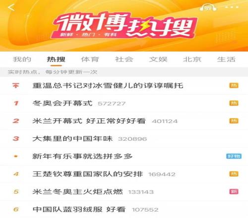 7日上午,“冬奧會(huì)開幕式”和“米蘭開幕式 好正常好好看”“中國(guó)隊(duì)藍(lán)羽絨服 好看”也登上微博熱搜。