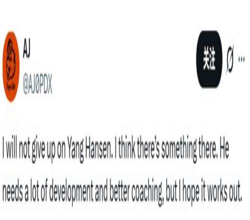 球迷AJ發(fā)文寫道:“我絕不會(huì)放棄對(duì)楊瀚森的期待。我相信他身上是有潛力的。他確實(shí)需要大量的打磨提升,也需要更優(yōu)質(zhì)的指導(dǎo),但我真心希望他能越來越好。”