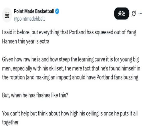 美媒Point Made Basketball寫道:“我之前就說過,開拓者今年能從楊瀚森身上挖掘出這么多價(jià)值,已經(jīng)算是意外之喜了??紤]到他尚且稚嫩的技術(shù)功底,以及年輕內(nèi)線球員本就陡峭的成長曲線 —— 尤其是結(jié)合他的技術(shù)特點(diǎn)來看 —— 他未來不僅能穩(wěn)穩(wěn)進(jìn)入球隊(duì)輪換陣容,還能打出實(shí)實(shí)在在的影響力,單是這一點(diǎn)就足以讓開拓者的球迷們興奮不已了??梢强吹剿虺鲞@樣靈光乍現(xiàn)的表現(xiàn)呢?你就會(huì)忍不住去暢想,一旦他把所有技術(shù)能力融會(huì)貫通,未來的上限究竟能有多高。”
