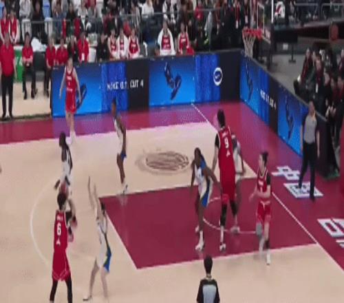 比賽開始:陳明伶跳球,球權(quán)給到張曼曼,中國隊的第一次進(jìn)攻被對手限制住。但是很快的,楊舒予一個快速突破,上籃拿分: