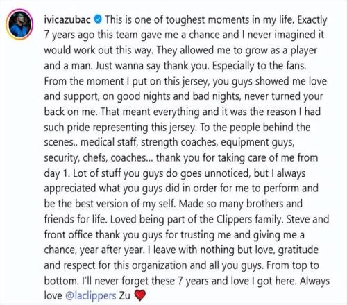 以下是祖巴茨的發(fā)文—— 這是我人生中最艱難的時刻之一。整整七年前,這支球隊給了我機會,我從未想過會以這樣的方式結束。他們見證了我從一名球員到一個男人的成長蛻變。千言萬語,唯有感謝。尤其要感謝球迷們。從我披上這件球衣的那一刻起,無論順境逆境,你們始終對我傾注愛意與支持,從未離棄。這份情誼重于一切,也是我身披快船戰(zhàn)袍時,心中滿溢自豪的源泉。