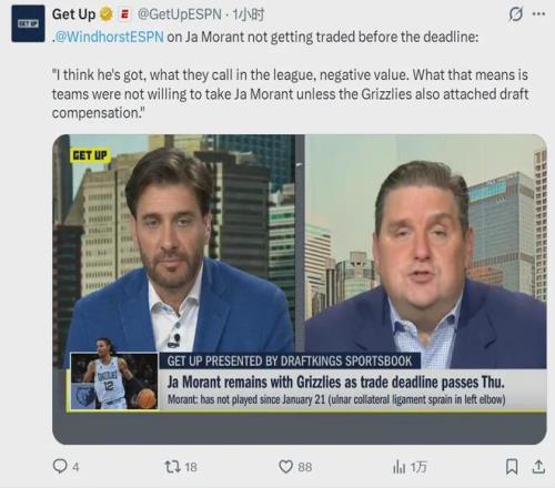 北京時(shí)間2月7日,ESPN名記Brian Windhorst在節(jié)目中,談及灰熊為何沒(méi)能送走莫蘭特:“很多人都說(shuō)莫蘭特毫無(wú)價(jià)值,但我覺(jué)得這個(gè)說(shuō)法并不準(zhǔn)確。因?yàn)槲艺J(rèn)為他現(xiàn)在就是負(fù)資產(chǎn),除非灰熊倒貼選秀權(quán),否則沒(méi)有球隊(duì)愿意接手。”