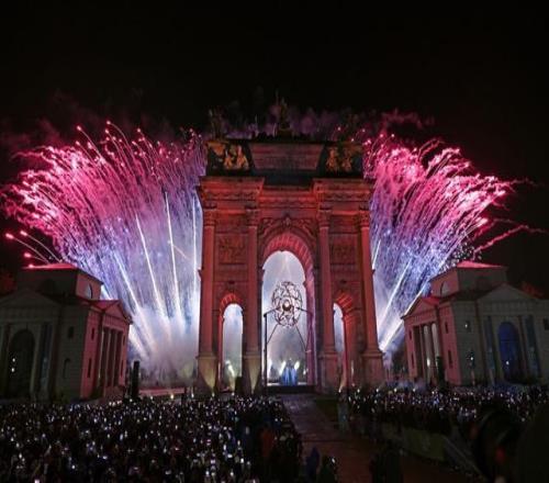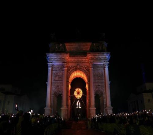 這是在米蘭和平拱門拍攝的主火炬被點燃。