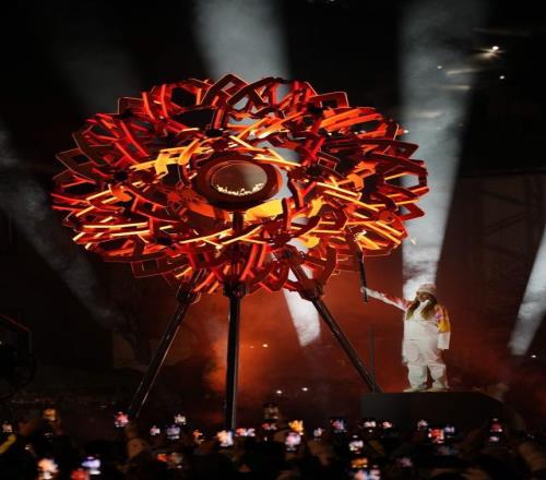 開幕式主會場圣西羅體育場大屏幕顯示主火炬被點燃。 來源:新華社客戶端 |