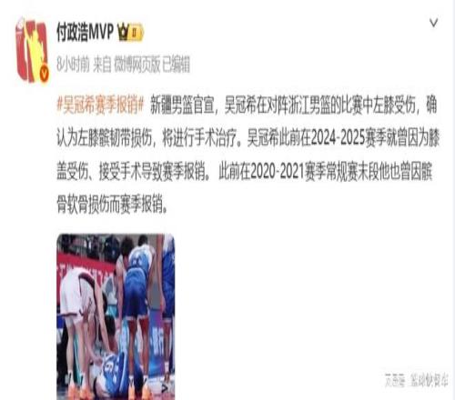 CBA聯(lián)賽又傳來一大悲劇。目前,CBA季中杯正如火如荼進行中,不過,對于新疆男籃而言,他們卻遭遇一大打擊。球隊主力中鋒吳冠希將因傷直接錯過本賽季,也就是我們俗稱的賽季報銷。自從2021年髕骨軟骨損傷賽季報銷后,在過去5年里,他已經(jīng)先后4次賽季報銷,成為CBA聯(lián)盟中不折不扣的玻璃人。很顯然,吳冠希的意外受傷,無論是對于新疆隊,還是對于他本人,都是一個晴天霹靂。