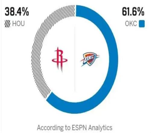 雷霆這邊問題不大,主力缺陣,角色球員均能站出來承擔(dān)責(zé)任,上一場雖然不敵馬刺,但仍有3人砍下20+。但是火箭當(dāng)下的困境不僅僅是傷病這么簡單,進攻端空間糟糕,僅杜蘭特能穩(wěn)定輸出,申京近期狀態(tài)低迷,攻守兩端心不在焉,阿門與申京不兼容、投射短板明顯,謝潑德上場后易被針對,需隊友頻繁補防,一旦收縮內(nèi)線便會給對手外線空位機會。加之火箭近期競技狀態(tài)糟糕、精氣神不足,賽前ESPN看衰火箭,賽前勝率預(yù)測,火箭取勝概率只有38.4%,雷霆61.6%。