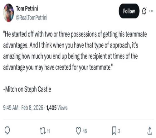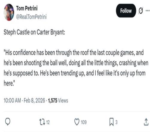 卡斯?fàn)栐诖虺錾闹购髣t感謝了球迷的支持:“能夠擁有這座城市與球迷的愛,讓我登場打球都會美好的有些不真實感,尤其是在職業(yè)生涯還很年輕的時候,真的是太特別了。” 除此之外,卡斯?fàn)柗Q贊了另外一名新星卡特布萊恩特,直言自己感覺到了他在過去幾場比賽信心爆棚,不僅投籃手感火熱,細(xì)節(jié)也做得很到位,他的狀態(tài)一直在提升,顯然會越來越好。
