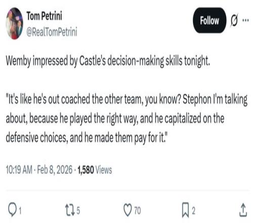 賽后文班也對卡斯?fàn)柋緢龀錾臎Q策能力大加贊賞到:“感覺他就像教練組一樣把對方耍得團團轉(zhuǎn),你懂我的意思吧?卡斯?fàn)柎虻煤芎侠?,一直在作出正確的決策,抓住對手的漏洞,讓他們付出了代價?!?/p>