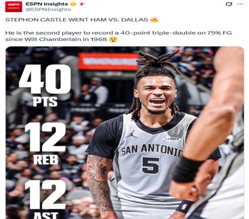 狂轟40分12板12助超級大三雙,4號秀卡斯?fàn)柵qR大戰(zhàn)刷爆紀(jì)錄搶戲文班!馬刺隊4大新星齊暴走天賦溢出。