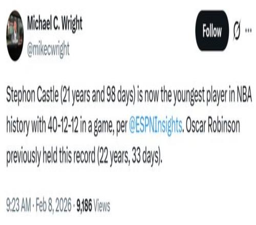 同時卡斯?fàn)柌?1歲零98天,這讓他打破此前由大O(22歲33天)保持的歷史紀(jì)錄,成為NBA歷史上單場拿到至少40分12板12助最年輕的球員。