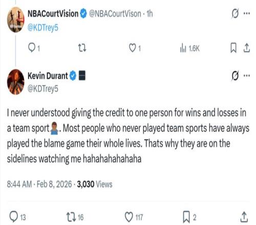 除此之外,杜蘭特還回?fù)袅诉B續(xù)三個(gè)賽季該為球隊(duì)失敗擔(dān)責(zé)的言論,坦言籃球是一項(xiàng)團(tuán)隊(duì)運(yùn)動(dòng),不能將勝利和失敗的功勞或責(zé)任歸于一個(gè)人,很多人從未參與過(guò)團(tuán)隊(duì)運(yùn)動(dòng),只是癡迷于相互指責(zé)。