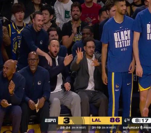 完勝!老詹20+10新援爆發(fā),格林9+6庫里興奮慶祝,里夫斯16分7罰
