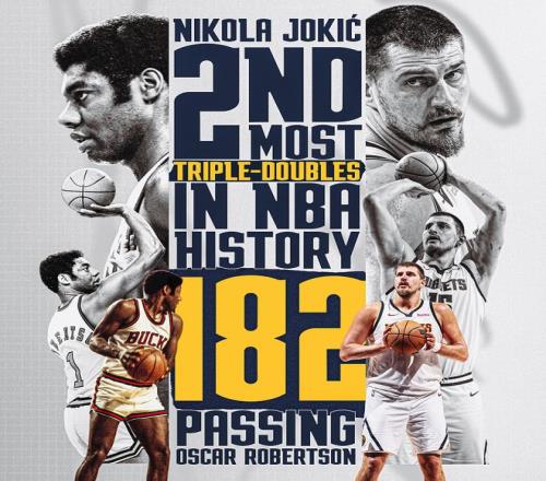 生涯里程碑!約基奇182次三雙超越大O獨(dú)占?xì)v史第2,距離威少還差25次