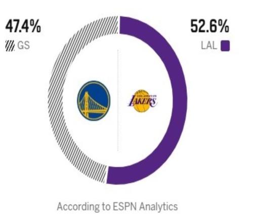 北京時(shí)間2月8日,NBA常規(guī)賽迎來湖人與勇士的豪門對(duì)決,遺憾的是,勇士這邊巴特勒賽季報(bào)銷,庫里和新援波爾津吉斯因傷缺陣,而湖人這邊也少了東契奇與艾頓,這也讓這場比賽少了不少看點(diǎn)。本賽季雖然勇士遭遇嚴(yán)重的傷病,但是他們在外線的投籃總能給人驚喜,也總有奇兵站出來幫助球隊(duì)爆冷拿下勝利,上一場比賽,勇士就擊敗了太陽,目前以28勝24負(fù)的戰(zhàn)績位列西部第八。反觀湖人這邊近期拿到二連勝,以31勝19負(fù)的戰(zhàn)績位列西部第五。雖然東契奇缺陣,但是里夫斯回歸后就打出驚艷的表現(xiàn),上場對(duì)陣76人狂砍35分,聯(lián)手詹姆斯帶隊(duì)拿到勝利。本場比賽,考慮到勇士客場作戰(zhàn)加上隊(duì)內(nèi)三大得分手都打不了,湖人拿到勝利的概率很大。ESPN數(shù)據(jù)賽前預(yù)測,湖人拿下勝利的概率為52.6%。