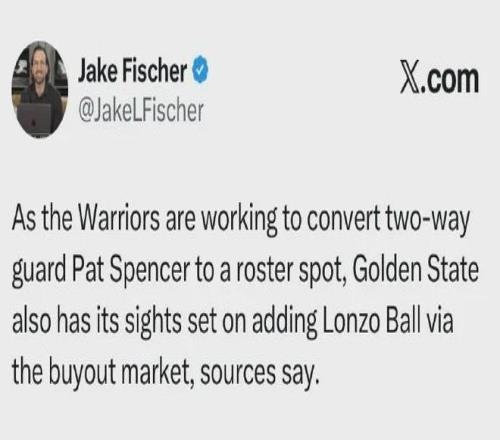 喲呵。 名記Fischer透露:勇士計(jì)劃在買斷市場里面簽下“球哥”朗佐-鮑爾......