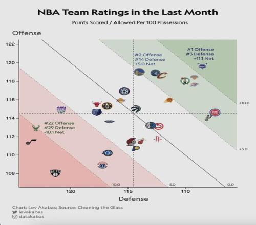 作為對比,聯(lián)盟第一的雷霆在2026年戰(zhàn)績是11勝8負(fù),東部第一的活塞在2026年的戰(zhàn)績是13勝5負(fù)。再看一組數(shù)據(jù):過去一個月黃蜂的進(jìn)攻效率聯(lián)盟第一,防守效率聯(lián)盟第三,凈效率也是聯(lián)盟第一。沒有什么征兆,黃蜂突然崛起了。