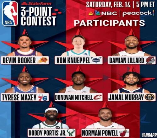 NBA全明星三分大賽具體8人名單: 利拉德(開(kāi)拓者) 布克(太陽(yáng)) 克努佩爾(黃蜂) 馬克西(76人) 米切爾(騎士) 穆雷(掘金) 波蒂斯(雄鹿) 鮑威爾(熱火)