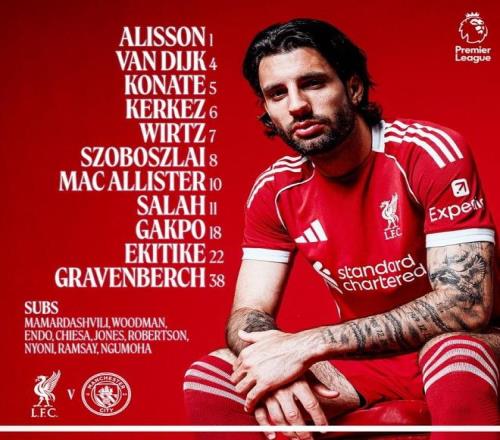 利物浦首發(fā):1-阿利松、8-索博斯洛伊、4-范戴克、5-科納特、6-凱爾凱茲、38-赫拉芬貝赫、10-麥卡利斯特、7-維爾茨、11-薩拉赫、18-加克波、22-?;倏?/p> 替補(bǔ):25-馬馬爾達(dá)什維利、28-伍德曼、3-遠(yuǎn)藤航、14-費(fèi)代里科-基耶薩、17-柯蒂斯-瓊斯、26-羅伯遜、42-尼奧尼、47-卡爾文-拉姆齊、73-恩古莫哈 曼城首發(fā):25-多納魯馬、27-馬特烏斯-努內(nèi)斯、45-胡桑諾夫、15-格伊、21-艾特-努里、16-羅德里、20-伯納多-席爾瓦、33-尼科-奧賴?yán)?2-塞門(mén)約、7-馬爾穆什、9-哈蘭德 替補(bǔ):1-特拉福德、3-魯本-迪亞斯、4-賴因德斯、6-阿克、10-謝爾基、14-尼科-岡薩雷斯、47-福登、68-馬克斯-阿萊恩、82-里科-劉易斯