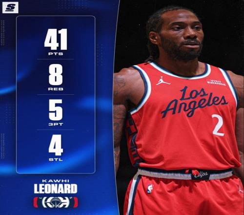 倫納德這場比賽34分鐘,30中14,三分11中5,罰球10中8,拿到41分8籃板2助攻4搶斷,命中率46.7%,三分命中率45.5%,真實(shí)命中率59.6%,正負(fù)值+20。