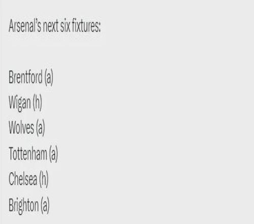 阿森納未來6場(chǎng)比賽:客戰(zhàn)布倫特福德、主戰(zhàn)維岡、客戰(zhàn)狼隊(duì)、客戰(zhàn)熱刺、主戰(zhàn)切爾西、客戰(zhàn)布萊頓。 4個(gè)客場(chǎng),除了客戰(zhàn)狼隊(duì),恐怕都不好踢……除了對(duì)維岡的比賽,其余都必須拿下且不能大意,踢維岡就大輪換吧! |