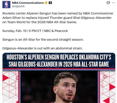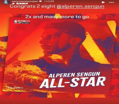 好消息:申京遞補(bǔ)入全明星 由于亞歷山大遭遇腹部肌肉拉傷,確認(rèn)無(wú)法出戰(zhàn)全明星,NBA總裁蕭華指定申京入選全明星,后者將頂替亞歷山大代表國(guó)際隊(duì)參賽。 這一消息對(duì)于申京無(wú)疑是巨大的認(rèn)可,他此前在落選之后,曾不止一次公開(kāi)表示自己非常期待入選全明星,如果能夠遞補(bǔ)入選一定會(huì)出戰(zhàn)。