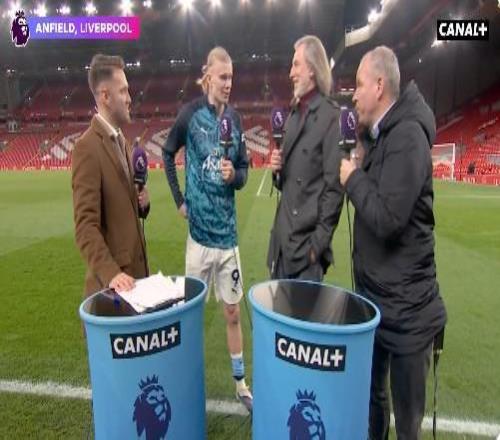 英超第25輪,曼城客場2-1戰(zhàn)勝利物浦,曼城前鋒哈蘭德賽后接受了CANAL+體育的采訪。