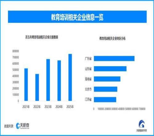 天眼查的股權(quán)全景穿透圖與股東信息功能成為研學(xué)產(chǎn)業(yè)價值篩選的重要工具。在產(chǎn)業(yè)整合過程中,投資者通過股權(quán)全景穿透圖可清晰掌握企業(yè)的股權(quán)結(jié)構(gòu)與資源關(guān)聯(lián),評估其核心競爭力與發(fā)展?jié)摿?,推動?yōu)質(zhì)資源向頭部企業(yè)集中;對于學(xué)校和家長而言,查詢研學(xué)機構(gòu)的股東背景,可了解企業(yè)是否具備實力雄厚的背書,判斷其服務(wù)品質(zhì)與可靠性,讓研學(xué)旅行的教育價值得到更有力的保障。 教育補習(xí):合規(guī)引領(lǐng)與素質(zhì)轉(zhuǎn)型并行,賦能青少年全面成長 “雙減”政策常態(tài)化背景下,寒假教育補習(xí)市場完成了深刻的價值重構(gòu),從過去的 “應(yīng)試提分”轉(zhuǎn)向“素質(zhì)賦能”的高質(zhì)量發(fā)展軌道。 如今,家長的教育需求更趨理性,不再盲目追求學(xué)科成績的短期提升,而是更關(guān)注孩子的興趣培養(yǎng)、能力提升與個性化發(fā)展,這種轉(zhuǎn)變直接推動了素質(zhì)教育賽道的崛起,成為寒假教育補習(xí)市場的核心增長動力。? 行業(yè)的合規(guī)化進程為教育補習(xí)的價值落地提供了制度保障。相關(guān)部門持續(xù)強化監(jiān)管力度,規(guī)范市場秩序,打擊違規(guī)辦學(xué)行為,引導(dǎo)行業(yè)回歸教育本質(zhì)。在合規(guī)化的大趨勢下,具備完善資質(zhì)、優(yōu)質(zhì)師資與科學(xué)課程體系的機構(gòu)得以持續(xù)發(fā)展,而缺乏核心競爭力的小作坊式機構(gòu)逐漸被市場淘汰,行業(yè)集中度不斷提升。 同時,科技賦能成為行業(yè)升級的重要驅(qū)動力,智能教學(xué)工具的應(yīng)用與個性化教學(xué)方案的推出,讓教育補習(xí)更具針對性與效率性,更好地滿足了學(xué)生的個性化成長需求。? 天眼查專業(yè)版數(shù)據(jù)顯示,截至目前我國現(xiàn)存在業(yè)、存續(xù)狀態(tài)的教育培訓(xùn)相關(guān)企業(yè)超533.7萬家。其中,2025年新增注冊相關(guān)企業(yè)約75.8萬余家,從企業(yè)注冊數(shù)量趨勢來看,近五年間,教育培訓(xùn)相關(guān)企業(yè)的注冊數(shù)量大體呈現(xiàn)出增長態(tài)勢,并在2025年達到頂峰。 從區(qū)域分布來看,廣東省、江蘇省、山東省教育培訓(xùn)相關(guān)企業(yè)數(shù)量位居前列,三個省市數(shù)量總和超過4800家,占企業(yè)總數(shù)的41.5%。