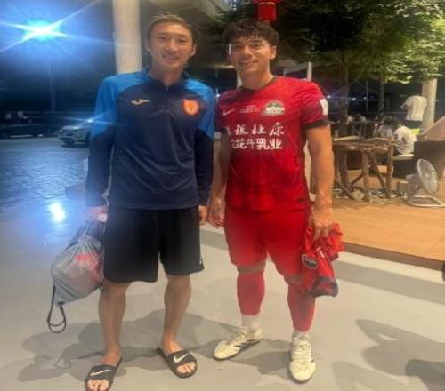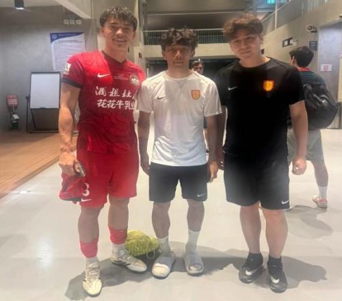 河南隊(duì)后衛(wèi)周緣德曬與重慶銅梁龍后衛(wèi)晉鵬翔、和曉強(qiáng)合照,三人曾在2024賽季幫助大連英博沖超。