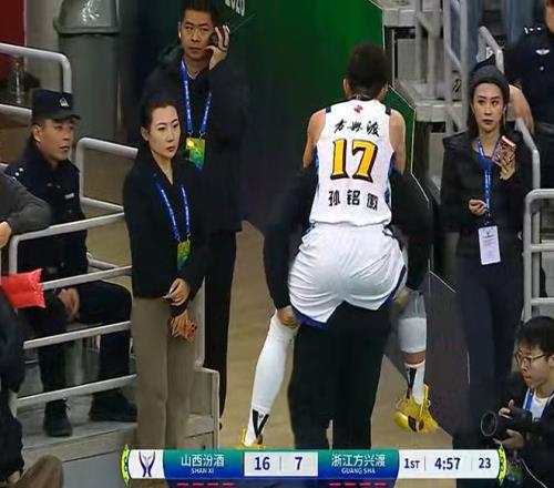 隨后,孫銘徽就躺在地上,捂著自己的腳,顯得十分痛苦,隊(duì)醫(yī)對(duì)他進(jìn)行簡(jiǎn)單治療之后,他還是無法行走,最后,隊(duì)友將孫銘徽背出了賽場(chǎng)。