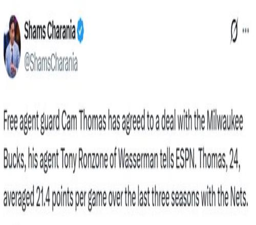隨后,托馬斯回應(yīng)簽約雄鹿的選擇?!拔疫x擇密爾沃基,是因為他們想要我,而且他們告訴我,已經(jīng)關(guān)注我、對我感興趣好幾年了。所以能等到這個機會、最終實現(xiàn),感覺很棒。我現(xiàn)在就期待和大家見面、熟悉彼此,然后盡快為球隊做出貢獻?!?/p> 此前,名記Fischer就報道,盡管籃網(wǎng)此前收到過關(guān)于托馬斯的交易報價,但雄鹿是唯一一支真正對他有實質(zhì)興趣的球隊。如今托馬斯成為自由球員,雄鹿簽下也是順理成章。 “我沒聽說過有哪支球隊想要托馬斯。唯一傳出有意的就是雄鹿,但他們之前不愿意付出選秀資產(chǎn)來交易得到他。這是我自始至終聽到的唯一一支對托馬斯有興趣的球隊?!边@是Fischer當時的報道。