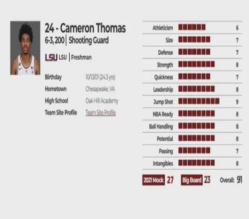 當(dāng)然我們主要還是看托馬斯的實(shí)力,他被許多球迷認(rèn)為是低效刷子型球員,之所以能得到場均20+的得分全得益于趕上籃網(wǎng)隊擺爛進(jìn)程,籃網(wǎng)近距離觀察四年最清楚他的真實(shí)實(shí)力,籃網(wǎng)提供的續(xù)約報價就是年薪1000萬美元的兩年合同,這基本就代表他是角色球員實(shí)力,而只簽兩年也是對未來沒有太多信心. 首先我還是放上托馬斯當(dāng)初的選秀報告做參考,看看他為何僅是27順位秀,選秀綜合評分91分,在運(yùn)動能力評分為6非常低,選秀模板賽斯-庫里.