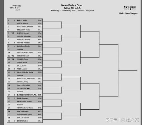 我們再來關(guān)注其它消息。北京時間昨天,本周的兩站ATP巡回賽相繼公布了正賽簽表。ATP500美國達(dá)拉斯公開賽,兩位本土名將弗里茨、謝爾頓位列前兩號種子,衛(wèi)冕冠軍是加拿大名將沙波瓦洛夫。