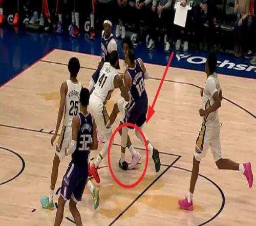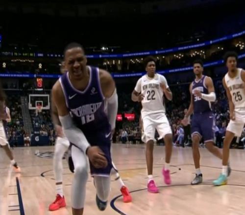易邊再戰(zhàn),錫安連續(xù)突破得手一人連拿6分,特雷-墨菲三分連中,鵜鶘領(lǐng)先國王多達21分。阿丘瓦上籃不中,威少沖刺跟進收下前場板并順勢完成隔人補扣,開心笑了。威少強突不慎踩到對手腳背明顯崴腳,表情痛苦,但好在并無大礙,鵜鶘竟然選擇挑戰(zhàn),最終失敗血虧還送兩次罰球。卡特失誤,墨菲三世搶斷后助攻菲爾斯完成快攻得分,米西再暴扣打成2+1,鵜鶘打出一波17-2超級攻擊波,已經(jīng)領(lǐng)先國王到30分。