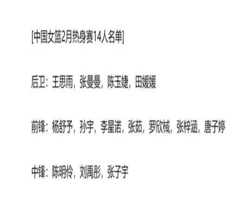 去年的全運(yùn)會(huì)之后,馬上就進(jìn)行了新賽季的WCBA女籃聯(lián)賽。而在聯(lián)賽常規(guī)賽進(jìn)行的后半段,中國女籃就進(jìn)行了一次集訓(xùn),楊舒予、陳明伶等球員去到國家隊(duì)報(bào)到,訓(xùn)練。國家隊(duì)也是特意感謝了各家俱樂部的配合和支持。而隨著2月1日,常規(guī)賽結(jié)束,女籃國家隊(duì)再度進(jìn)行了一下人員的微調(diào):張子宇、王思雨回歸。宮魯鳴帶領(lǐng)14名球員,開始新的熱身賽。