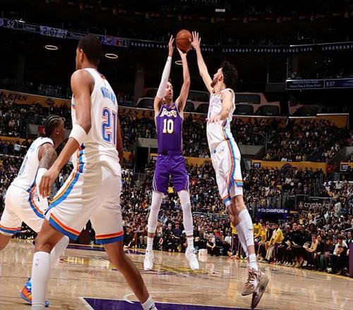 本場(chǎng)比賽中,在交易截止日前剛剛從亞特蘭大老鷹加盟湖人的替補(bǔ)后場(chǎng)新援盧克-肯納德(Luke Kennard)的表現(xiàn)還算是中規(guī)中矩??霞{德全場(chǎng)出場(chǎng)24分13秒,投籃5中3,三分線外2中1,得到了7分1籃板1助攻1搶斷的數(shù)據(jù),還有4次犯規(guī),正負(fù)值為-7。其實(shí)從表現(xiàn)來看,肯納德的整體狀態(tài)還是不錯(cuò)的,他在進(jìn)攻端還是展現(xiàn)出了自己全面的得分能力,他的手感看起來也是不錯(cuò)的。問題就在于,肯納德完全沒有辦法得到更多的出手機(jī)會(huì),這種情況下他在進(jìn)攻端的威力,特別是他的投射能力,也沒有辦法發(fā)揮出來。肯納德本來就是一名攻強(qiáng)于守的球員,指望他在其他方面起到更大的作用顯然也是一件不太現(xiàn)實(shí)的事情。很顯然,湖人還是沒有開發(fā)出肯納德的最大價(jià)值,他的功能并沒有體現(xiàn)出來。
