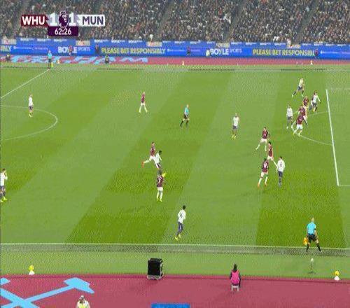 第50分鐘,鮑文右路低平球傳中,前點(diǎn)紹切克搶點(diǎn)將球捅入,西漢姆1比0曼聯(lián)。