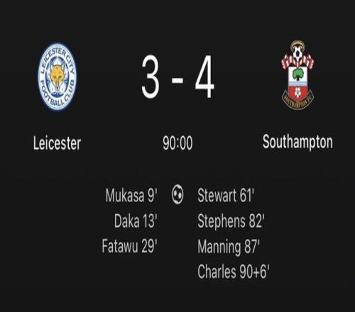 然而眼看勝局在握,萊斯特城卻在下半場(chǎng)離譜崩盤。斯圖爾特、斯蒂芬斯和曼寧在第61分鐘至第87分鐘這短短的26分鐘內(nèi)連進(jìn)3球,幫助做客的南安普頓扳平比分。