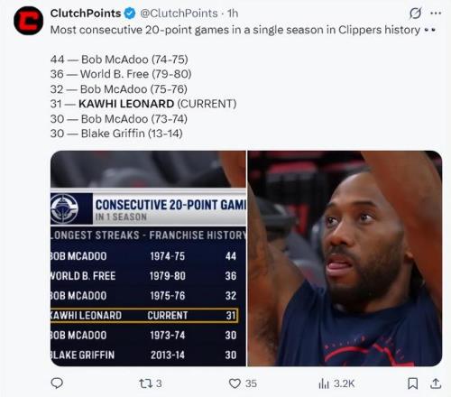 連續(xù)32場20+快船隊史第三!小卡刷紀錄吞里程悲在場16被迫打卡