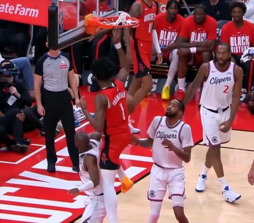 次節(jié)回來,謝潑德界外飛身救球,芬尼-史密斯釘板大帽米勒后再助攻阿門反擊完成暴扣。鄧恩搶斷一條龍過掉防守扣空籃,意外被籃筐帽下,鎖定今日五大囧,隨后又接連完成兩次搶斷,但最終都沒有轉(zhuǎn)化為得分,兩邊打得確實都辣眼睛。謝潑德切球被吹犯規(guī),火箭挑戰(zhàn)成功取消犯規(guī)還拿到球權(quán),這一波賺大了。大洛和小瓊斯連中三分,快船反超比分,杜蘭特和伊森立馬兩記三分回應(yīng),大洛極限救球,快船反擊倫納德底角再中三分,快船反超4分。阿門強突造殺傷后再中三分,半場戰(zhàn)罷,火箭52-51領(lǐng)先快船。