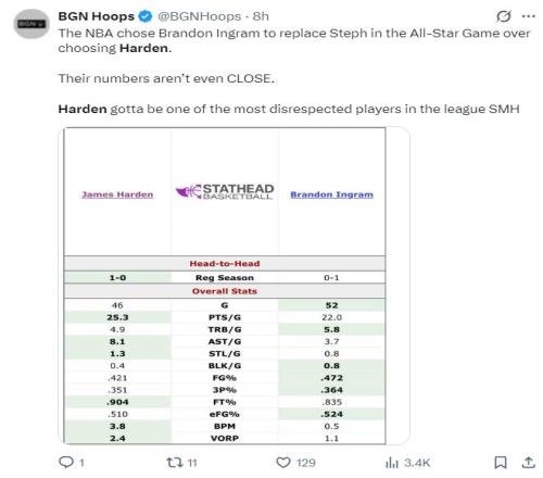 美媒BGN Hoops 寫道,哈登居然沒有被選為全明星,這簡直是徹頭徹尾的打劫,蕭華選英格拉姆頂替庫里參與全明星而不選哈登,這兩人的表現(xiàn)根本不是一個等級的,哈登是這個聯(lián)盟最不受尊重的球星之一,太無語了。 哈登場均25.3分8.1助攻4.9籃板1.3搶斷0.4蓋帽,命中率42.1%,三分命中率35.1%,罰球命中率90.4%; 英格拉姆場均22分5.8籃板3.7助攻0.8搶斷0.8蓋帽,命中率47.2%,三分命中率36.4%,罰球命中率83.5%。