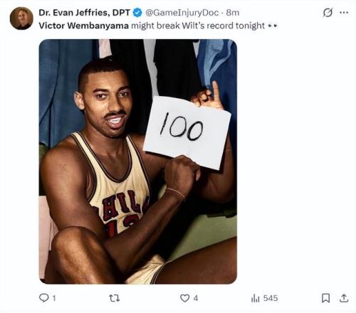 洛杉磯的醫(yī)學(xué)專(zhuān)家埃文-杰弗里斯:這個(gè)夜晚的文班亞馬就是張伯倫降臨。