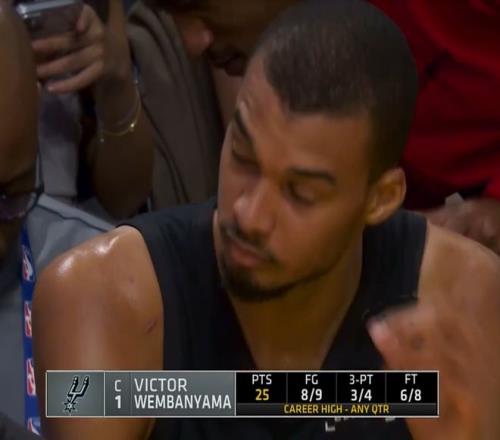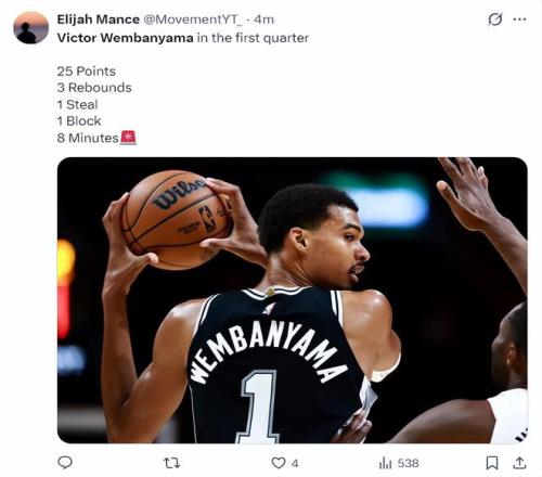 首節(jié)7分59秒,9中8,三分4中3,罰球8中6,拿到25分3籃板1搶斷1蓋帽,命中率88.9%,三分命中率75%,真實(shí)命中率99.8%,正負(fù)值+13,文班亞馬這個(gè)天賦真是炸裂異常。