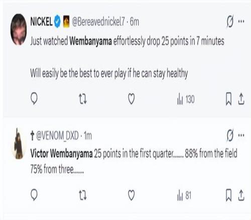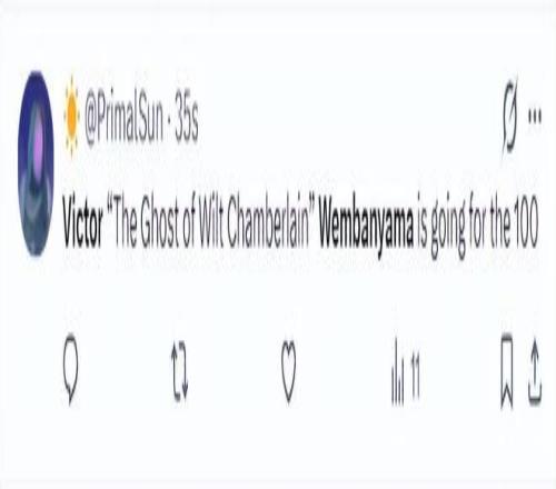 美球迷:文班亞馬這是要打破張伯倫單場(chǎng)100分的紀(jì)錄嗎?(8分鐘25分,那么16分鐘就是50分,24分鐘就是75分,32分鐘就是100!當(dāng)然這是一種夸張的說(shuō)法,文班亞馬要打破單場(chǎng)100分的紀(jì)錄還是很難) |