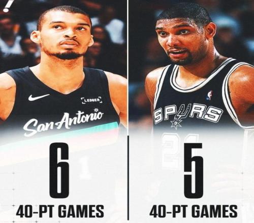 在文班亞馬的帶領下,馬刺半場轟下84分,創(chuàng)造隊史第二高紀錄,僅次于1984年的87分。 最終文班轟下40分也追平個人賽季得分紀錄,并且是其生涯第6次砍下40+得分,在比鄧肯少打1236場的情況下,40+場次已經超越鄧肯,追平吉諾比利升至隊史第4。