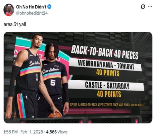 馬刺強勢崛起 這意味著,馬刺隊這支老牌強隊在被迫短暫擺爛后,又將迎來漫長的爭冠期。 因為不僅是文班,卡斯爾、哈珀與卡特布萊恩特三大新星的表現也是可圈可點,過去兩場文班與卡斯爾連續(xù)砍下40+成為馬刺自1984年格文和邁克-米切爾后,首對在連場砍下40+的雙人組。
