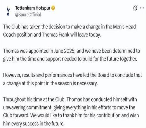 北京時(shí)間2月11日傍晚18點(diǎn)20分,熱刺官方發(fā)布公告:托馬斯·弗蘭克不再擔(dān)任一線隊(duì)主帥,即刻生效。距離球隊(duì)1-2輸給紐卡斯?fàn)?,僅僅過(guò)去12個(gè)小時(shí)。這樣一來(lái),52歲的弗蘭克,就這樣成為本賽季英超第7位正式下課的主帥。前6人分別是:9月,諾丁漢森林解雇努諾,西漢姆送走波特;10月,波斯特科格魯離開(kāi)森林;11月,狼隊(duì)與佩雷拉分道揚(yáng)鑣;1月,切爾西的馬雷斯卡、曼聯(lián)的阿莫林相繼下課。