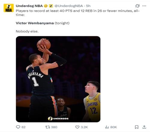 這場(chǎng)比賽文班亞馬的表現(xiàn)過于炸裂,他一戰(zhàn)創(chuàng)造了太多太多的紀(jì)錄: 1.文班亞馬首節(jié)25分生涯新高; 2.單節(jié)25分是本賽季第三高; 3.首節(jié)25分是賽季第二高僅次于哈登; 4.文班亞馬單節(jié)25分鐘是馬刺隊(duì)史有統(tǒng)計(jì)以來單節(jié)新高; 5.文班亞馬22歲38天首節(jié)25分PBP時(shí)代最年輕; 6.單場(chǎng)25分創(chuàng)歷史中鋒首節(jié)得分新高; 7.單場(chǎng)25分是馬刺隊(duì)史第三; 8.本世紀(jì)第16位在短短5分鐘里連拿21分的球員; 9.半場(chǎng)第33次30+超越馬努升至隊(duì)史第九; 10.文班上半場(chǎng)37分賽季新高 11.文班半場(chǎng)37分是馬刺PBP時(shí)代上半場(chǎng)最高紀(jì)錄; 12.文班半場(chǎng)37分是自張伯倫單場(chǎng)100分后首位中鋒; 13.自96-97賽季以來,首位上半場(chǎng)拿到至少37分+8籃板的球員;